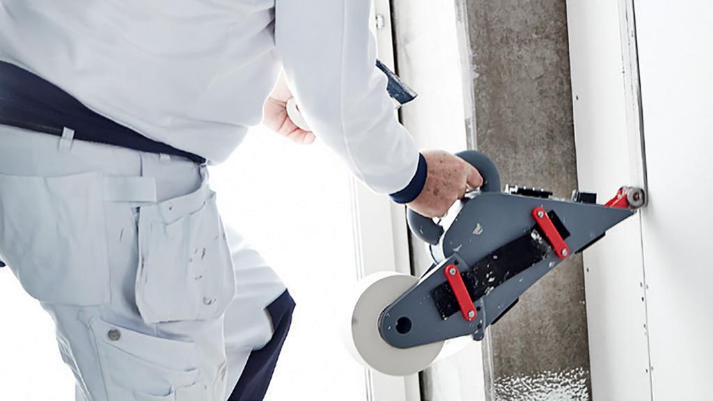 verktyg som applicerar spackel och fäster remsa på gipsskivor i ett och