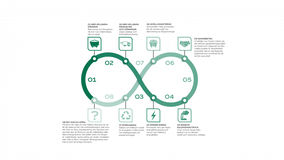 Att ta tillvara resurser och skapa mer av mindre, innebär att vi måste tänka hållbarhet i hela flödet. Från råvara, produktion och distribution till konsumtion, återvinning och destruktion. Och tillbaka till råvara, i ett slutet kretslopp. Det gör vi tillsammans med alla våra partners - och givetvis med dig som är kund. AkzoNobel har för närvarande en global andel förnybar energi på 40 procent och andelen i Norden är hela 60 procent. Målet för Norden är 100 procent år 2020.